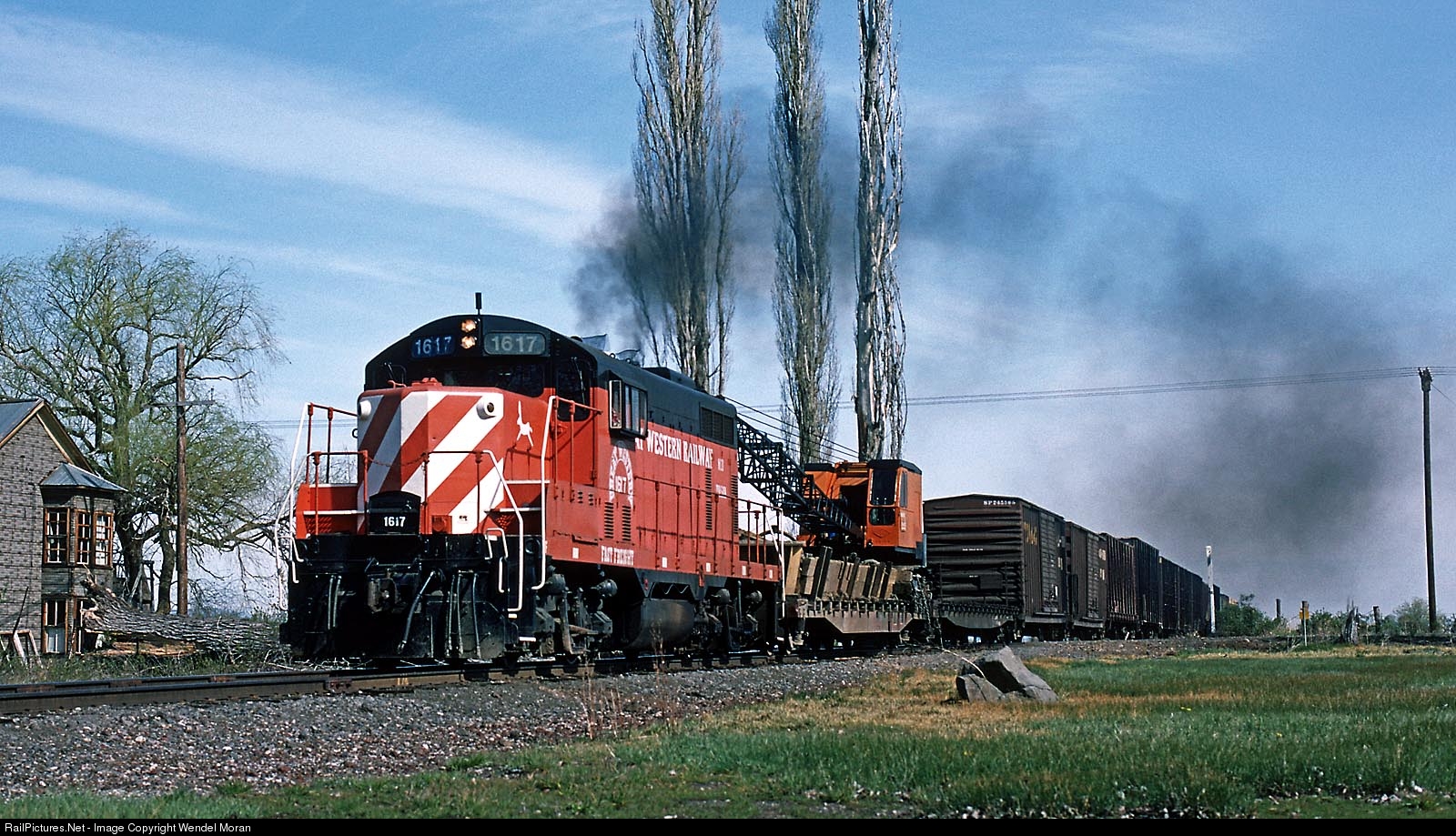 The hamlet of Davis Creek, California is the apex of a southbound grade on the Lake County Railroad, as trains climb away from Goose Lake. Less than three months after the line was acquired from Southern Pacific, a Great Western freight train crosses Westside Road at the site of the Nevada-California-Oregon narrow gauge's Davis Creek station.