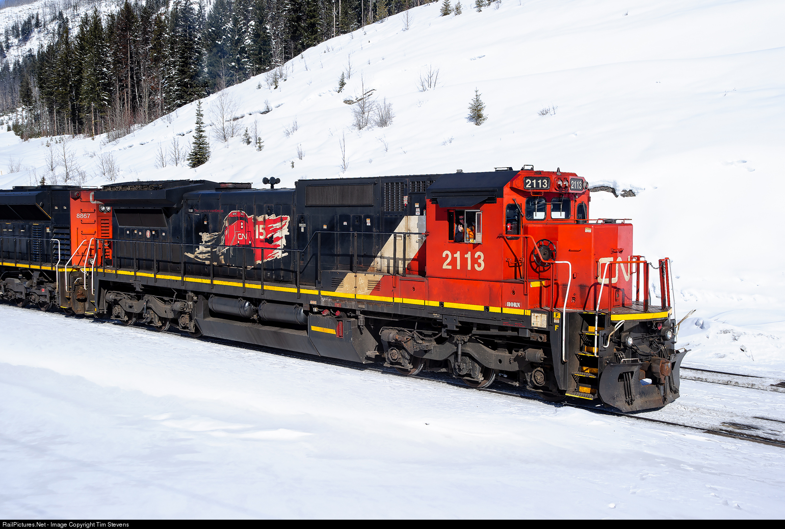 CN C40-8 2113 wears a 15th anniversary logo for CN's privatization, looking good in the sun near Grant Brook, BC.