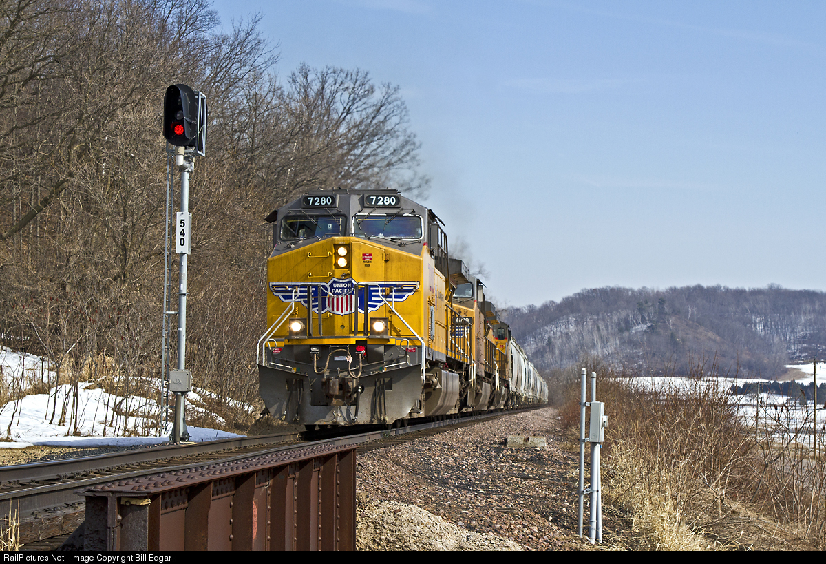 | UP 7280 heads a westbound train up Knapp hill just west of Knapp, WI. The train is down to about 20 mph with heavy sand loads supported by 3 GEs on the point and 2 more on the back as DPUs. Part of the reason for the slow climb is a slow order on Knapp's east side resulting from a derailment earlier this winter. No opportunity for a running start at the hill. |