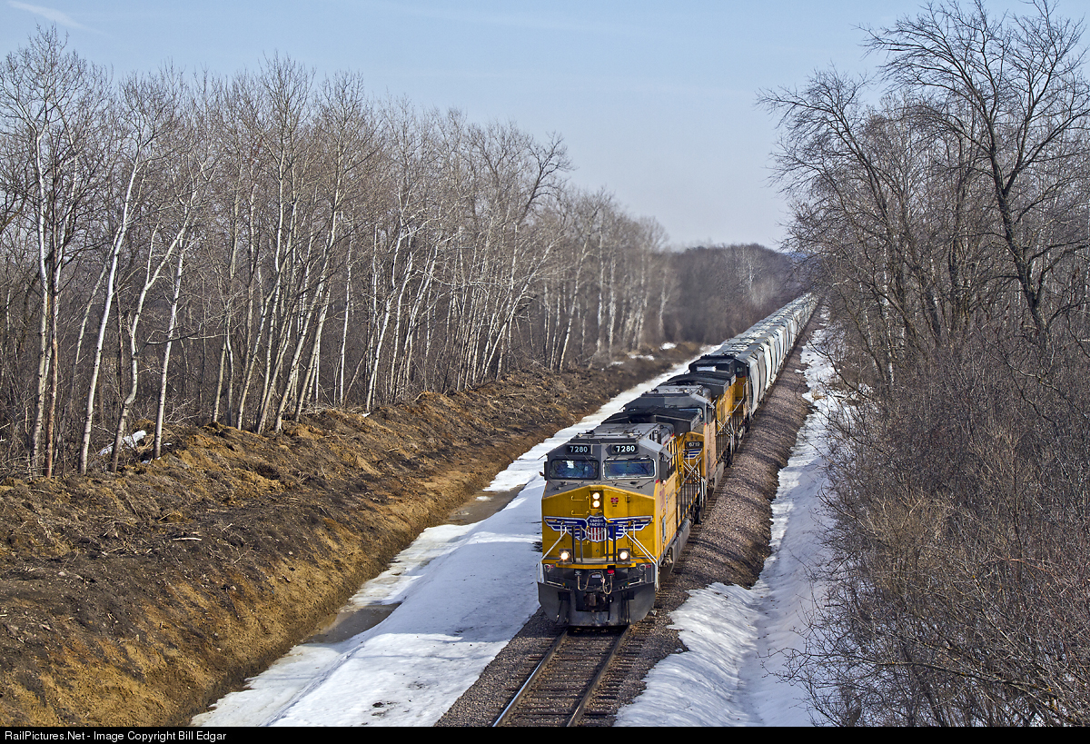 | UP 7280 rolls its train through fills and cuts on the old C&NW route of the 400 as it is about to pass under highway 128 west of Wilson, WI. The wide cut gives away the fact that this was a double track railroad into the early 1960s. |