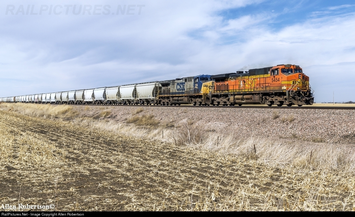BNSF 5454 & CSX 139 bring up the rear of what I think is a frac sand train.