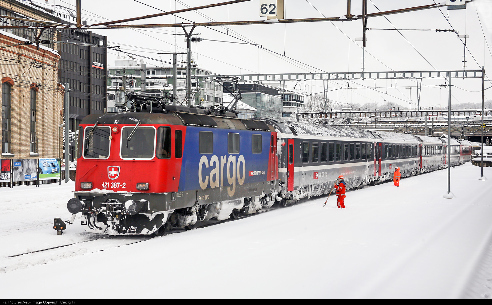 Re 421 # 387 of the SBB (in the red/blue Cargo paint scheme) is leaving Winterthur in deep snow in march 2006, with the Eurocity 196 Munich-Zürich. The Re 421 series have a certification to run in Switzerland, Germany and Austria and are used to pull the Eurocities between Zürich and Lindau (Germany) via Bregenz (Austria). Today, the locomotive is owned by the IRSI (International Rolling Stock Investment Gmbh) in Frauenfeld and is actually in the SBB works of Bellinzona for a revision R2. It should be reappear in a brand new paint scheme to run for the TR Trans Rail railway in the future.
