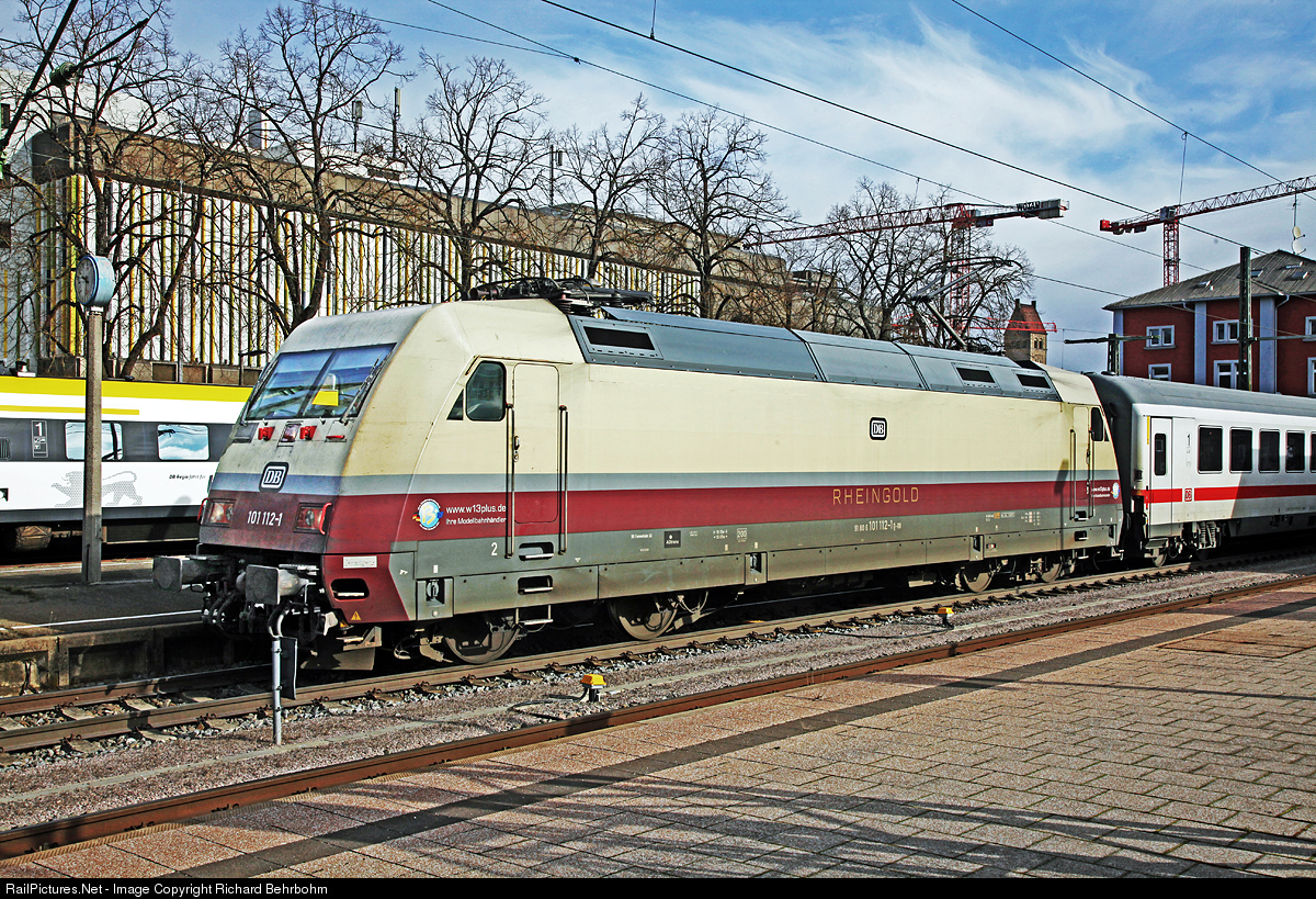 | 101 112 has a paint scheme in red and cream. These colours remember to the former famous "Rheingold Express". |