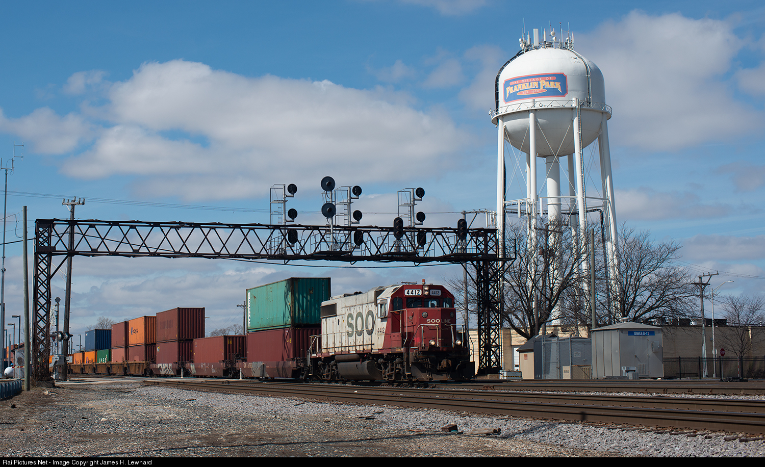 SOO 4412 leads train IM1 through tower B12 in Franklin Park IL.