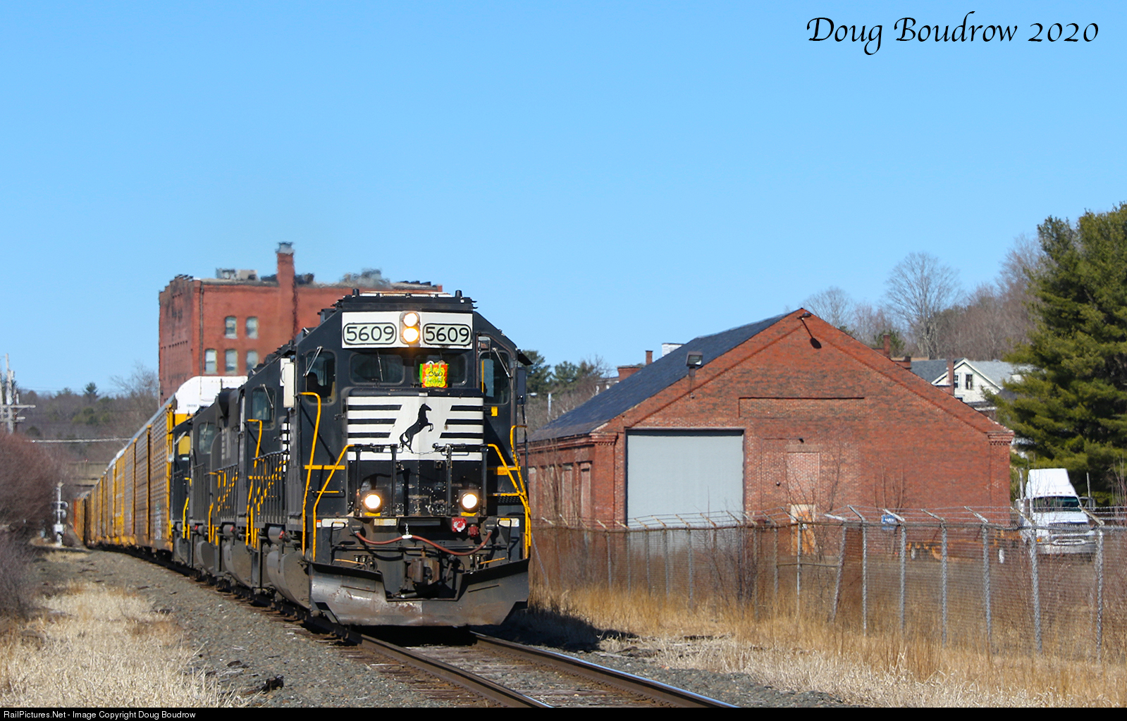 Pan Am Southern autorack train 27W is seen headed East through Erving, MA. The NS Geeps were unusual to see on this trackage in the past, but due to line restrictions on the detour routes, these units have been regular power for this train.