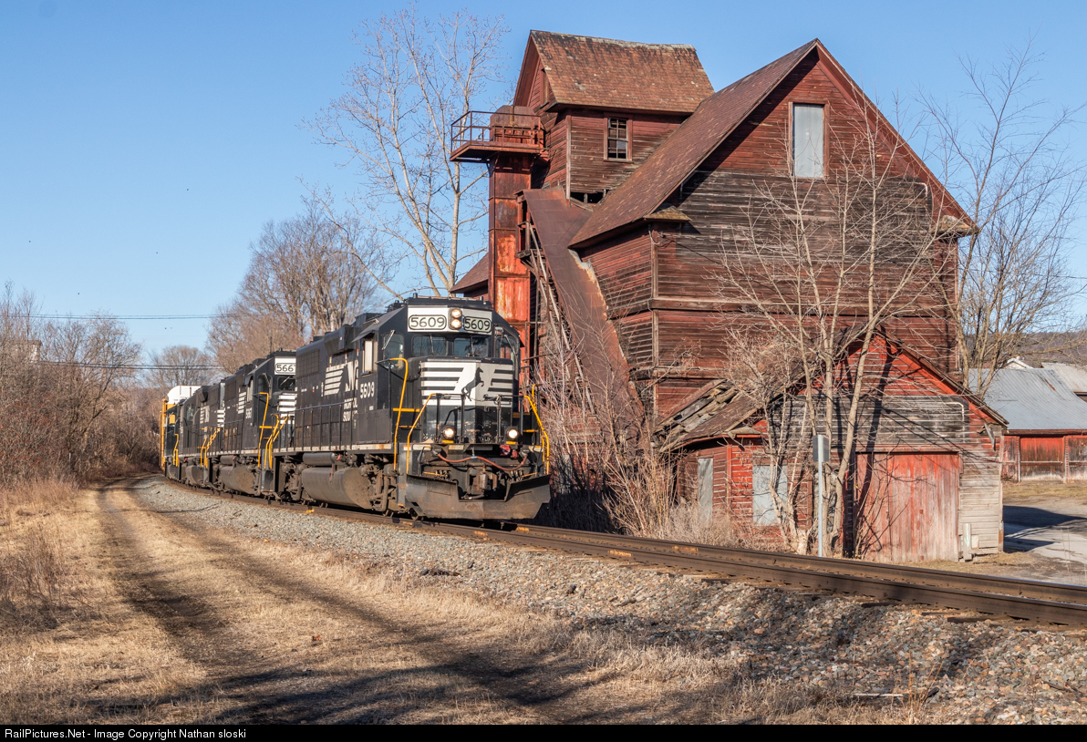 | NS 27W flies past the old coaling tower in Cobleskill, NY as it heads north on the NS D&H Line. The train is powered by an unusual consist of 4 GP38-2s which is a nice change of pace from the normal wide cab GEs that usually dominate this line. |