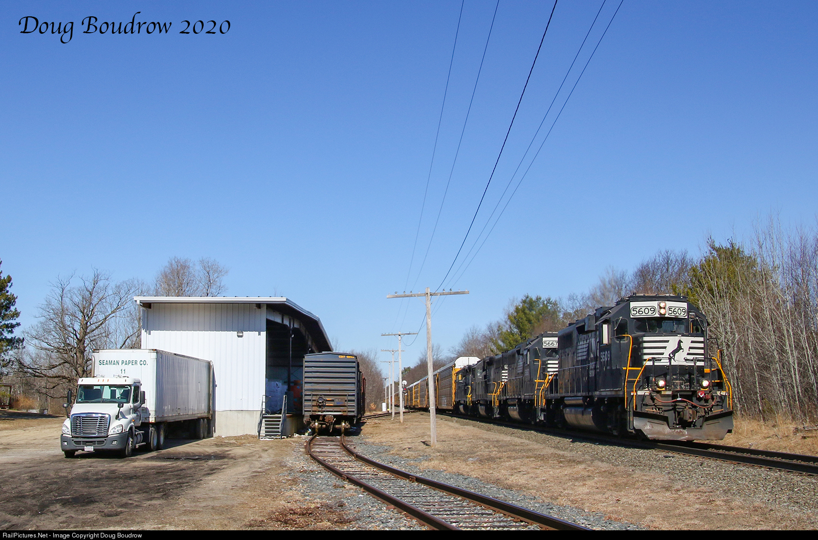 | Pan Am Southern autorack train 27W is seen headed East through Otter River. The NS Geeps were unusual to see on this trackage in the past, but due to line restrictions on the detour routes, these units have been regular power for this train.