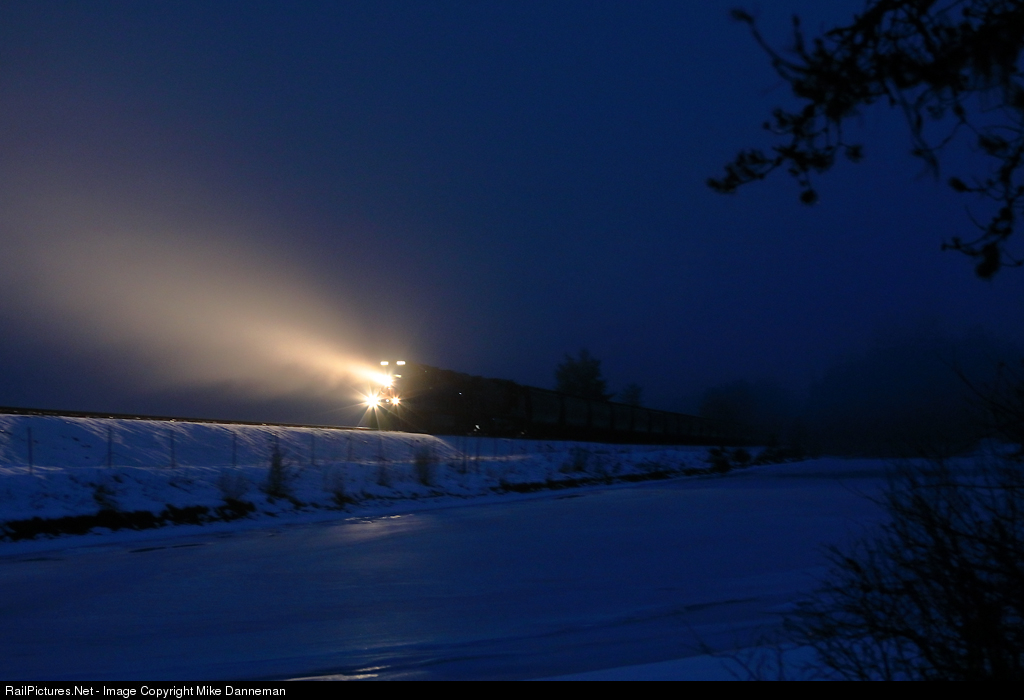 Late in the “blue hour” of January 25, 2020, a BNSF freight churns westbound in the light rain past a frozen Frog Pond just west of Trout Creek, Montana. Moisture-laden air thick with fog off the open waters of nearby Clark Fork glows in the headlights as the tonnage rolls west on Montana Rail Link’s Fourth Subdivision.