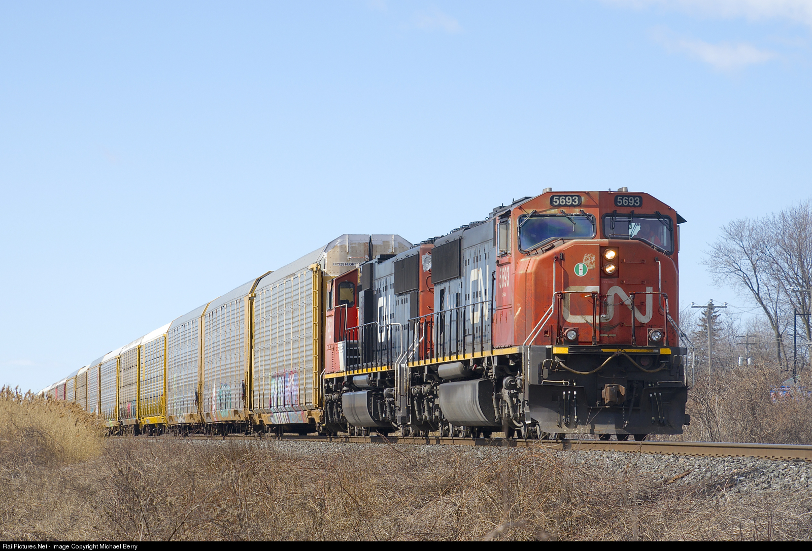 | CN 276 has SD75I's CN 5693 & CN 5731 for power and 112 autoracks as it cools its heels by MP 11 of CN's Kingston Sub. Due to congestion at Taschereau Yard up ahead it will sit here for about 45 minutes before heading east. |