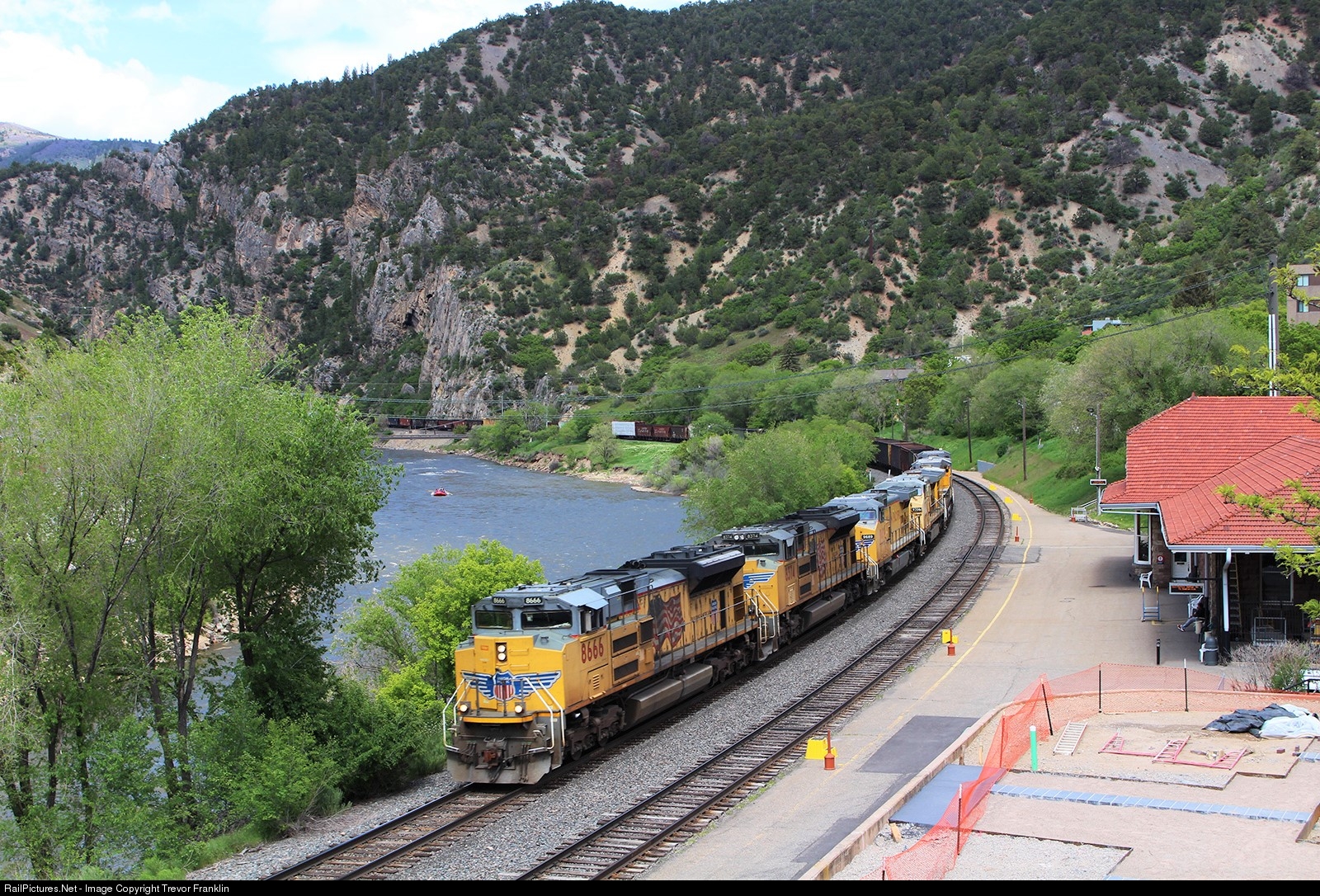 | A westbound manifest coasts by the Glenwood Springs depot along the Colorado River after exiting scenic Glenwood Canyon. The former D&RGW station dates back to 1904 and had a terrace on the west side before it was torn down. Hopefully whatever is being constructed doesn't obscure the view! |