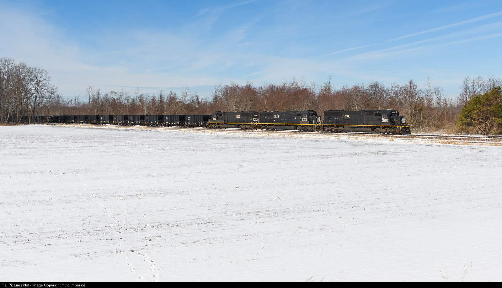 | A trio of former Illinois Central SD70's lead an iron ore train over the CN Bessemer Sub. Fresh snow blankets dormant fields as the train approaches the Pond Road grade crossing in West Springfield, Pennsylvania and accelerates after a 10 MPH restriction.