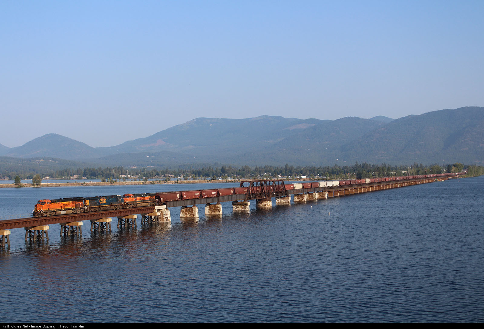 | A trio of GEs haul grain loads off the Hi-Line across the 4,769 ft trestle over the pristine waters of Lake Pend Oreille. This train is hot on the heels of a Z-train while two eastbounds are waiting in the wings at East Algoma as the morning's log jam on the busy "funnel" works itself out. |