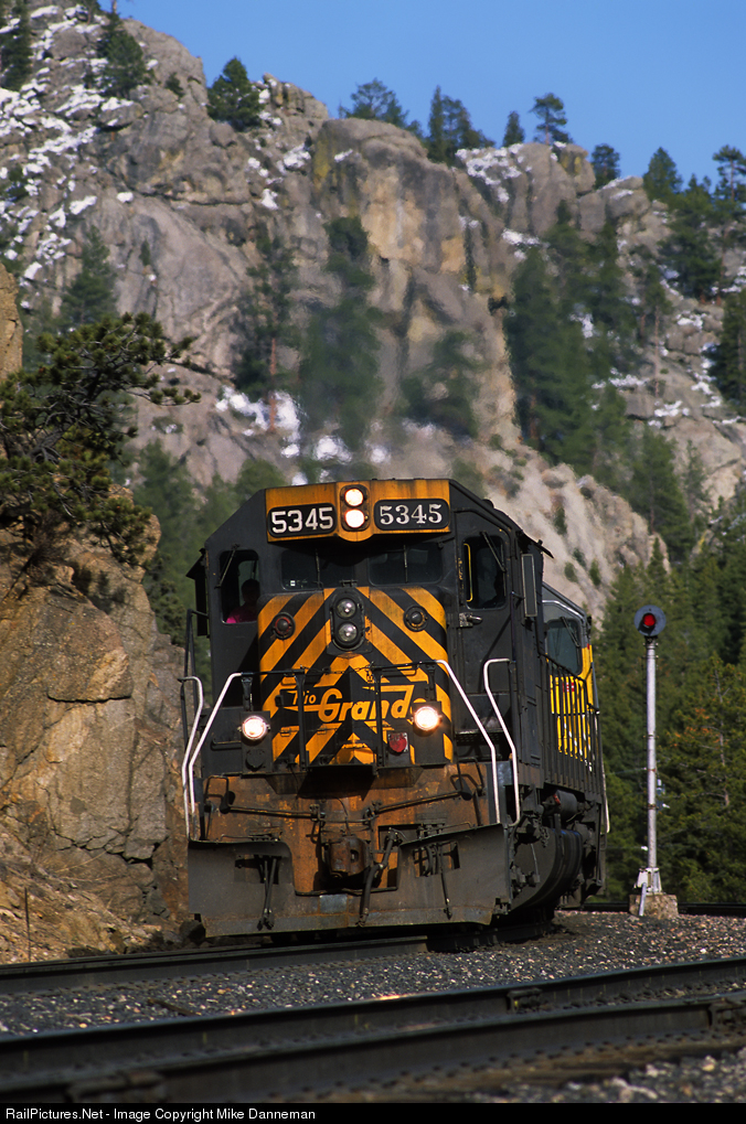 On April 14, 2001, a westbound Union Pacific manifest freight is led by Rio Grande EMD SD40T-2 “Tunnel Motor” No. 5345 as it pops out of the canyon into Pinecliffe, Colorado. Note that the unit has added ditch lights, but still retains it’s Mars light and class lights.