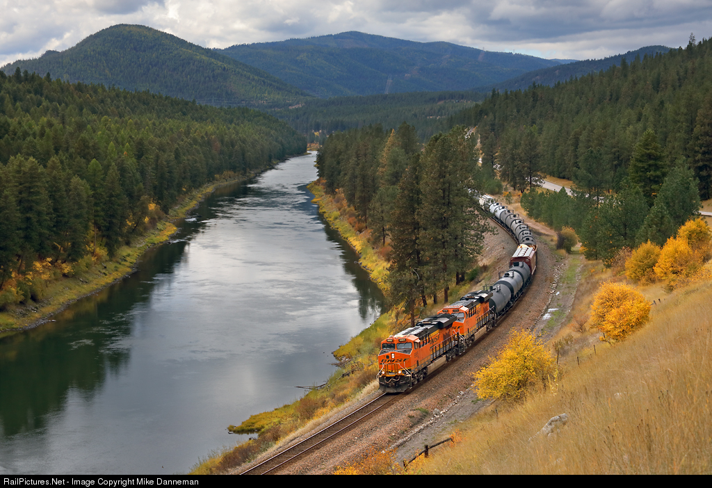 | A westbound BNSF freight curves along the Clark Fork west of the siding at Toole approaching Donlan, Montana, on October 8, 2019. |