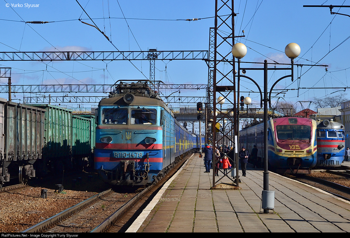 The electric locomotive VL10-1478 with a passenger train #108/107 Odesa - Uzhhorod is arriving to Stryi station. While two suburban electric trains EPL2T-030 and ER2-332 are waiting for their depart.