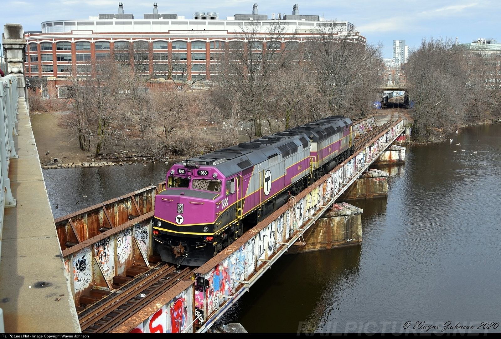 A Southside Rail-Extra crosses the Charles River on the Grand Junction Running Track after delivering five flatcars to a siding for storage. The five cars were picked up from the Grafton & Upton Railroad. Leading is #1063, which was recently rebuilt at MPI in Boise, ID, and reclassified as a F40PH-3C.