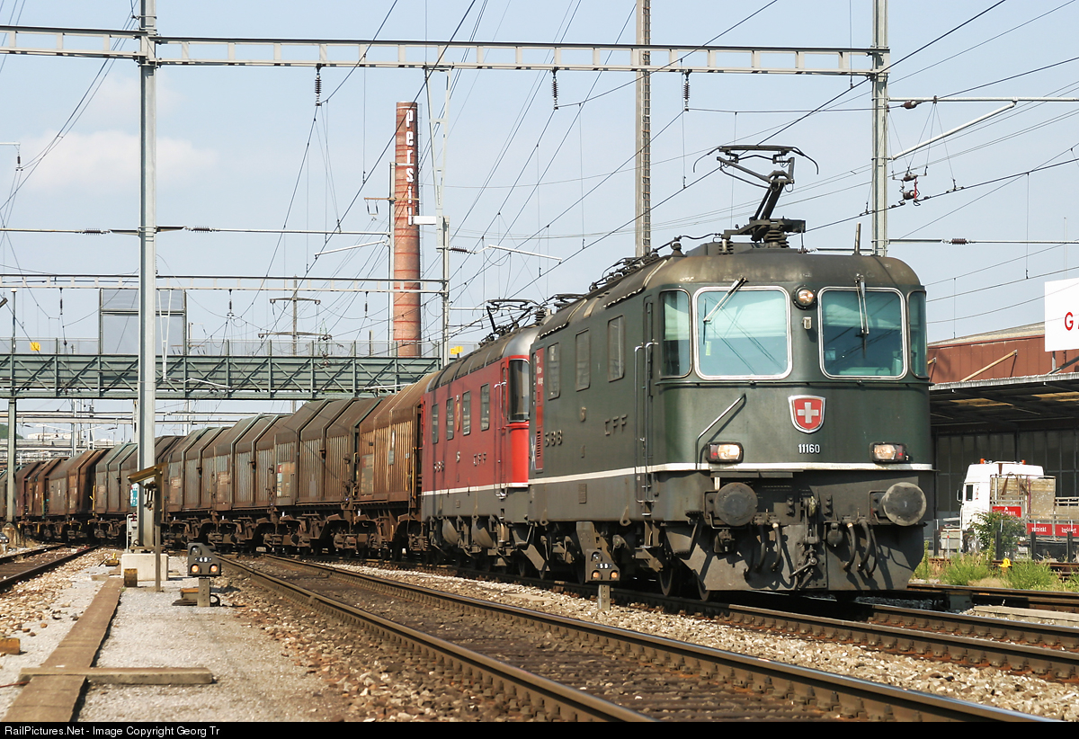 | Re 4/4 II # 11160 was the prototype for the installation of a cab climatisation. Together with a unknown Re 6/6 in multiple control ("Re 10/10") she is pulling a steel train through Pratteln.