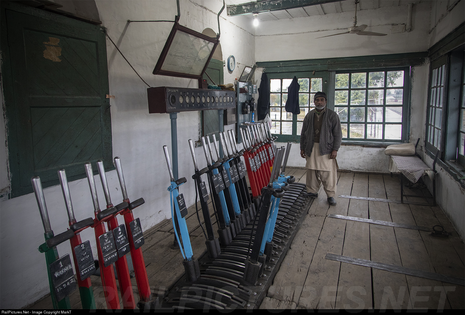 The signaller at Jhelum poses between trains next to his UK style lever frame.