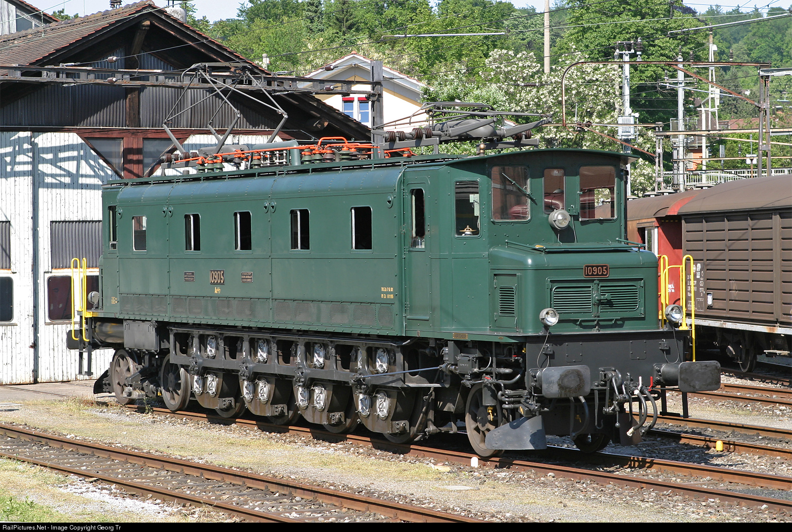 | Ae 4/7 # 10905 of SBB Historic in front of the depot Winterthur on the occasion of the depot event 2005. The locomotive was built in 1927 by SLM and BBC with the Buchli drive and 2300 kW, maximum velocity is 100 km/h. Since 1995 declared as historic vehicle and stabled in Buchs (SG). |