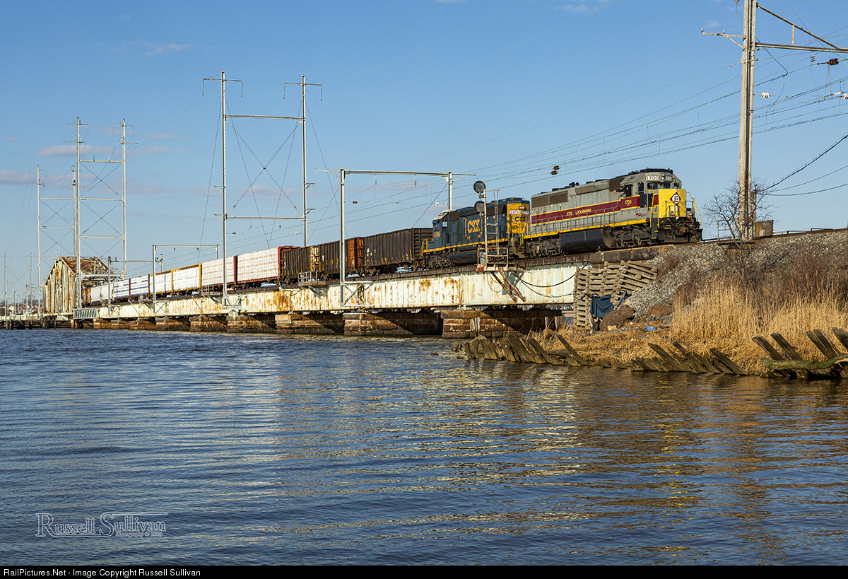 Conrail Shared Assets OI-16 crosses the Raritan River in South Amboy on a clear spring afternoon with SD45-2 1700 leading about 20 cars in tow for Browns Yard.
