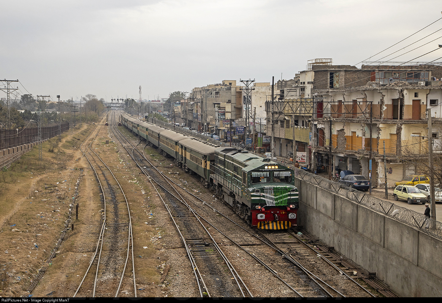 A chinese built CAT locomotive appraoches Rawalpindi. The decorations to the loco had been added to inaugurate a new container terminal in the port of Karachi the two days earlier before it was trusted to haul the Rehman Baba Express north to Peshawar.