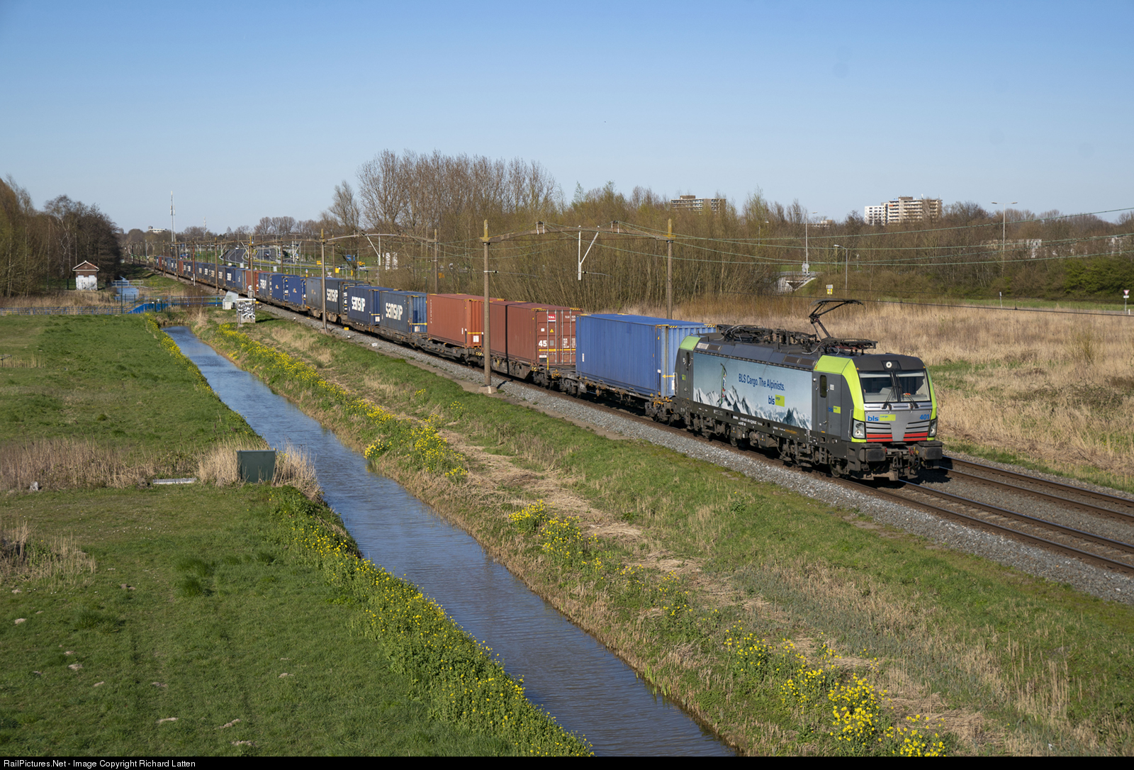 | A Swiss loco in the Netherlands: BLS Cargo Vectron Re 475 401 with a container shuttle Rotterdam Maasvlakte - Melzo (IT) near dordrecht Zuid on 22 March 2020. |