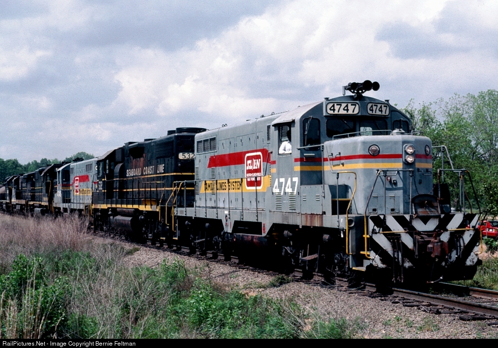 Seaboard System GP16 #4747 leads an eastbound train into the yard. #4747 was built May 1950 as Atlantic Coast Line GP7 #119 and later became Seaboard Coast Line #707. Unit was selected for the Tampa Uceta Shop rebuild program and released as GP16 #4747 in December 1980. After later becoming CSX #1793, unit was retired in January 1993. After leaving CSX roster, unit became R. J. Corman (RJCR) #1600