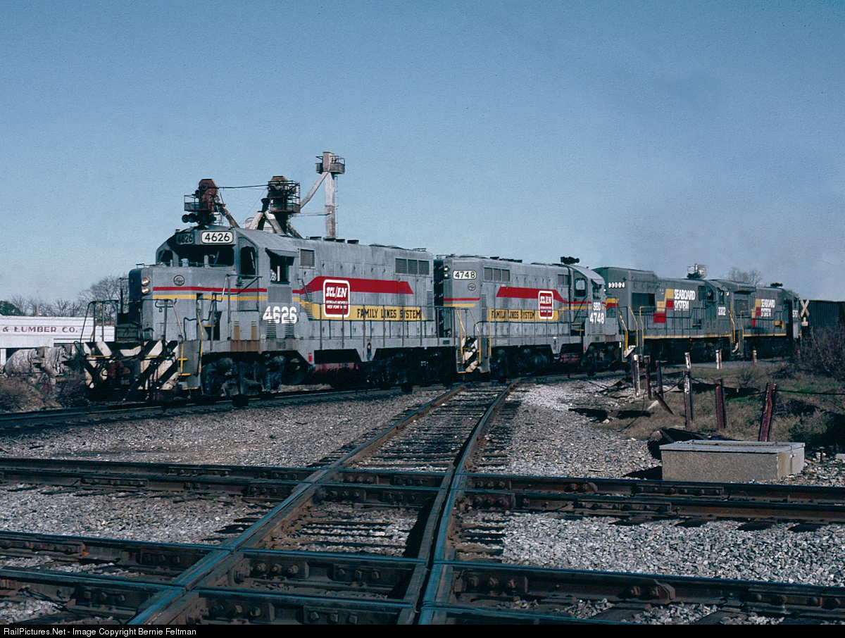Seaboard System GP16's #4626 & 4748, U23B #3302 & U36B #5757 lead a northbound over the former Seaboard Air Line and Southern Railway diamonds. #4626 was built November 1955 as Seaboard Air Line GP9 #1921 and later became Seaboard Coast Line #1020. In December 1980, unit was released from the Uceta GP16 rebuild program as SCL #4626 and later became CSX #1726. On January 13, 1993, unit was retired and became Tennessee Southern Railroad (TSRR) #1726