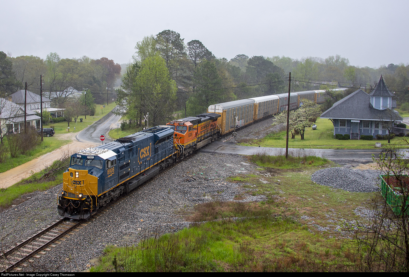 CSX ST70AH 8906 leads train Q64622 north through Ideal, GA, during a spring rain shower.