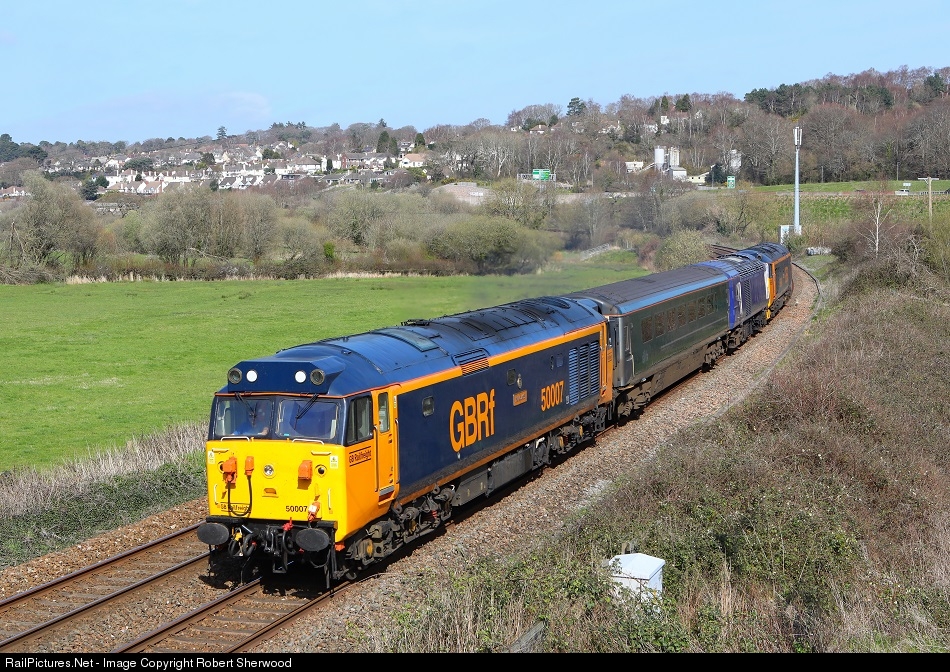 | 50007 hauls Mk 3 coach 12161, power car 43091 and 50049 past Langford Bridge working 5Z44 09:16 Long Marston to Laira on Monday 23rd March 2020 |