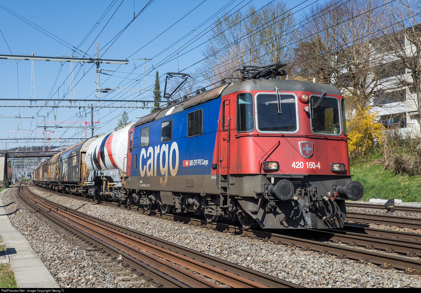 Re 420 # 160 of the SBB is pulling the freighttrain 63125 from Limmattal shunting yard via Winterthur freight yard to Wil GB (freight yard), between Winterthur and Winterthur Grüze.