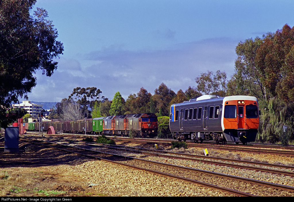 STA railcar 3022 overtakes an SCT freight from Melbourne led by G535 at Mile End.