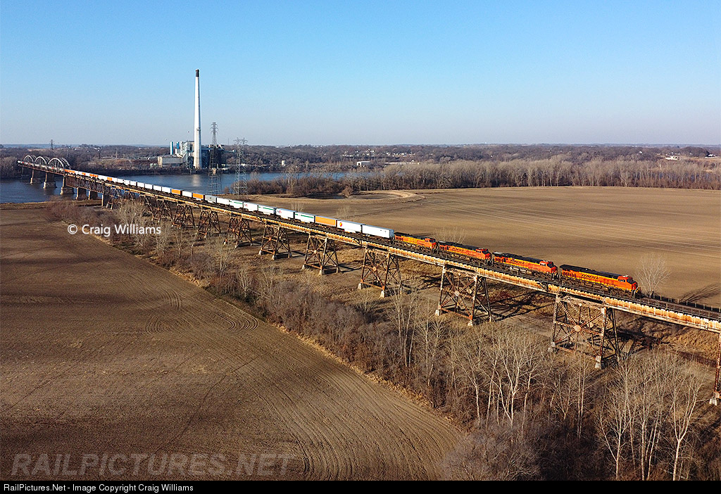 | The bridge at Sibley on the BNSF Marceline is an impressive bridge from the air. This 4100 foot and 90 feet high bridge over the Missouri River was built in 1915. It is one of the few places were a single track bottleneck still exist on the BNSF Transcon Mainline between Chicago and LA. Here a LA to Chicago Z-train of all trailer crosses the bridge on their eastbound journey.