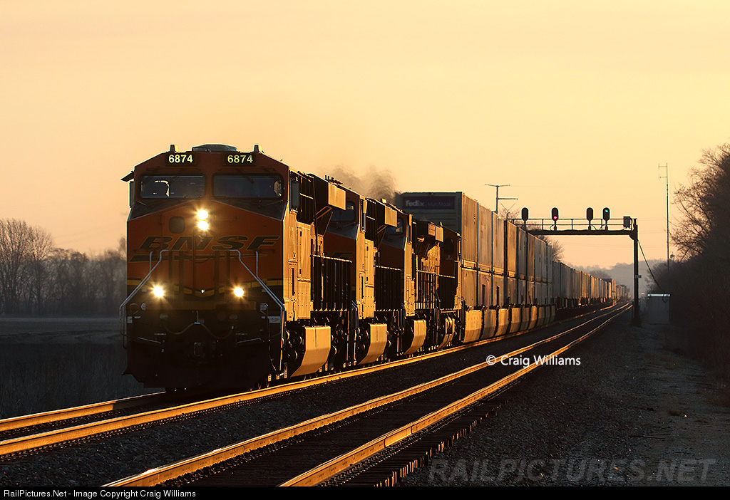 | Hotshot Willow Springs to San Bernardino Z rolls hard towards KC on the Marceline Sub. Here the train passes one of the few remaining ex-Santa Fe signal bridges left on the Marceline near Floyd at sunrise. The train will soon slam on the brakes and slow to 35 mph to cross the massive Sibley Missouri River Bridge 2 miles ahead. |