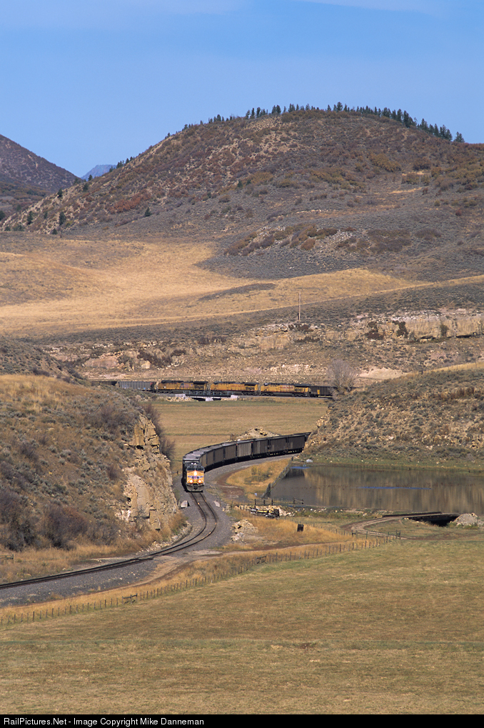 An empty Union Pacific coal train led by line GE AC4400CW No. 6963 heads up the Energy Spur several miles west of Adams Junction near Steamboat, Colorado, on October 16 2010. In the background is a 3-unit DPU (Distributed Power Units) crossing Trout Creek that meanders through the Saddleback Ranch at this location.