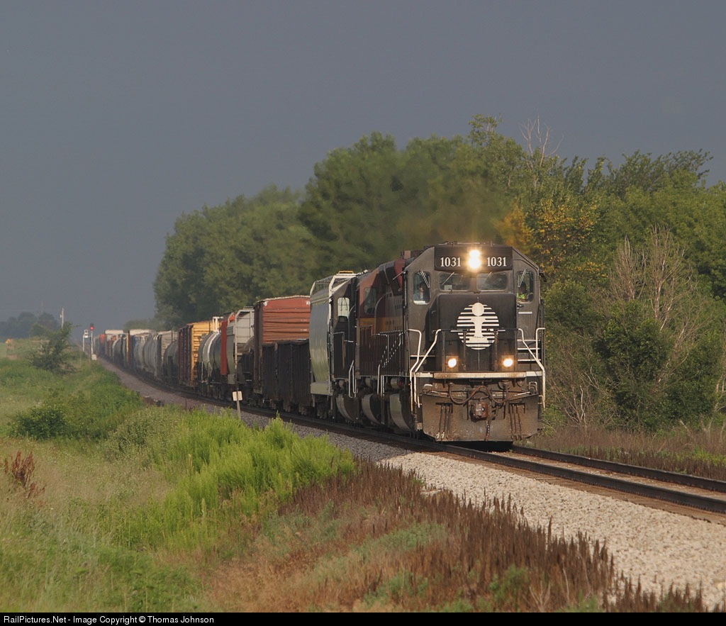 | Early morning storm light provides a dramtic effect as the daily freight train from Waterloo, IA - Chicago, IL heads east. |