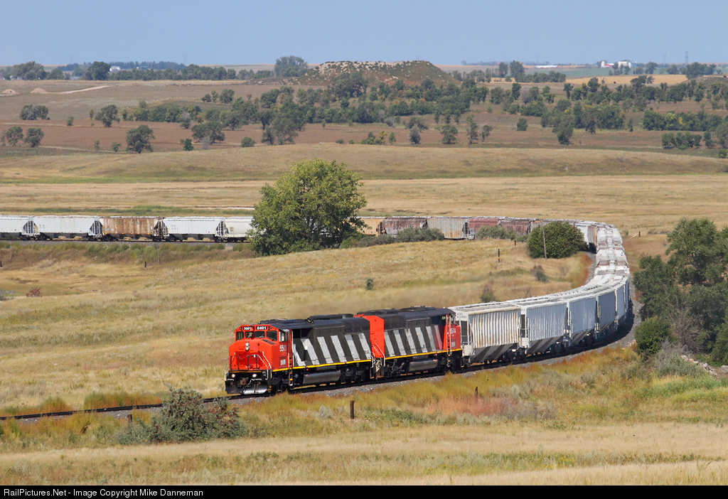 Dakota, Missouri Valley & Western’s “corn train” rounds the horseshoe curve south (east) of Merida, North Dakota, on August 29, 2018. The empty train has recently departed Blue Flint Ethanol located on the spur from Coal Creek Junction and is headed south on the Missouri Valley Subdivision. It will then go east at Bismarck and travel on DMVW’s Dakota Subdivision where it will be reloaded at two different elevators.