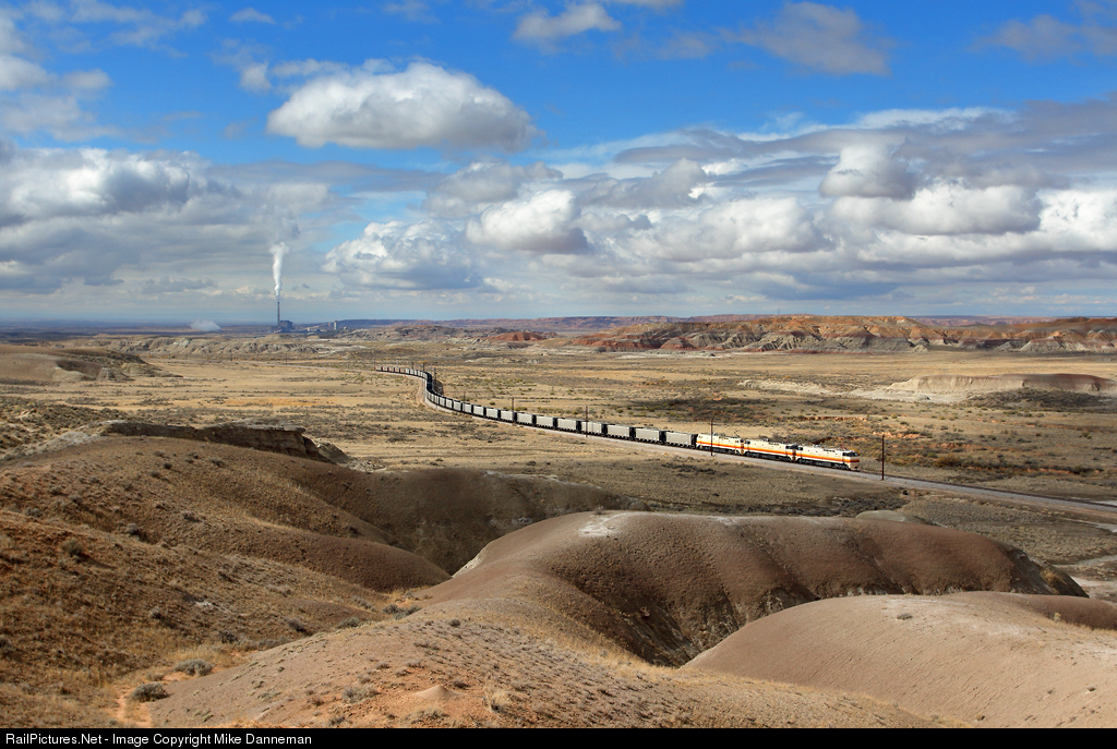 In the high desert area of eastern Utah, an eastbound Deseret Power Railway unit train passes through a region of mud mounds at milepost 31 a few miles east of the Bonanza Power Plant on a beautiful October 21, 2015.