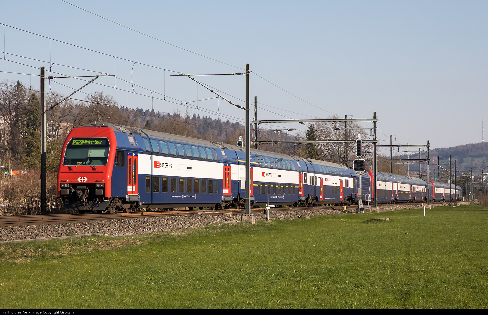 3 "DPZ" (doubledeck push-pull train) of the S-Bahn Zürich, with Re 450 # 087 in the rear, is running the S 12 service 19229 from Brugg (AG) via Dietikon-Zürich-Winterthur-Andelfingen to Schaffhausen. In Winterthur, one trainset in the rear will be uncoupled, because the length of the platforms between Winterthur and Schaffhausen isn't sufficient for a 300 meter long train.