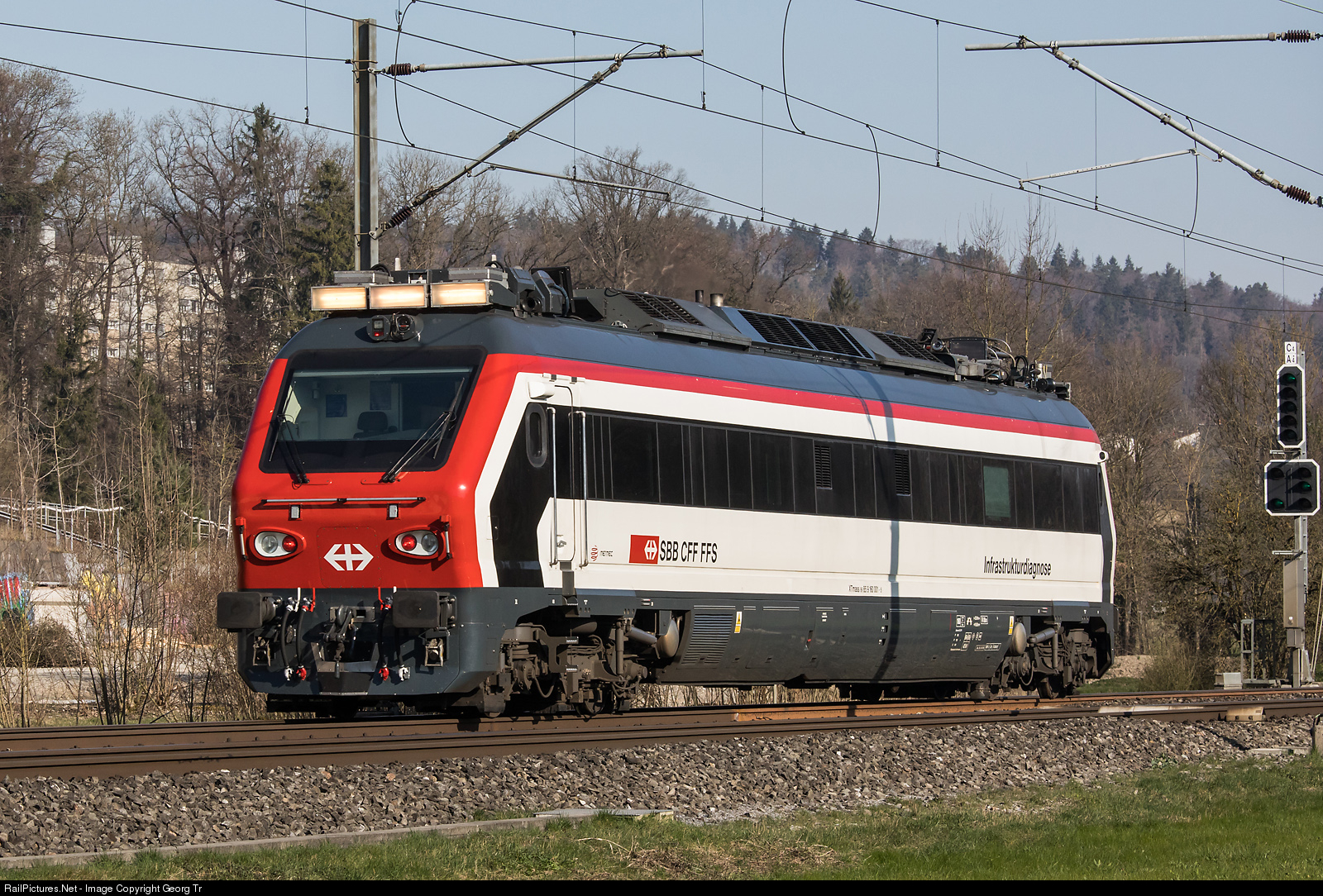 | Diesel powered measuring vehicle XTmass 160 # 001 of the SBB Infrastructure on a test run between Kemptthal and Winterthur Tössmühle. With this vehicle, at least two times per year, all SBB lines were controlled and a large amount of data recorded. |