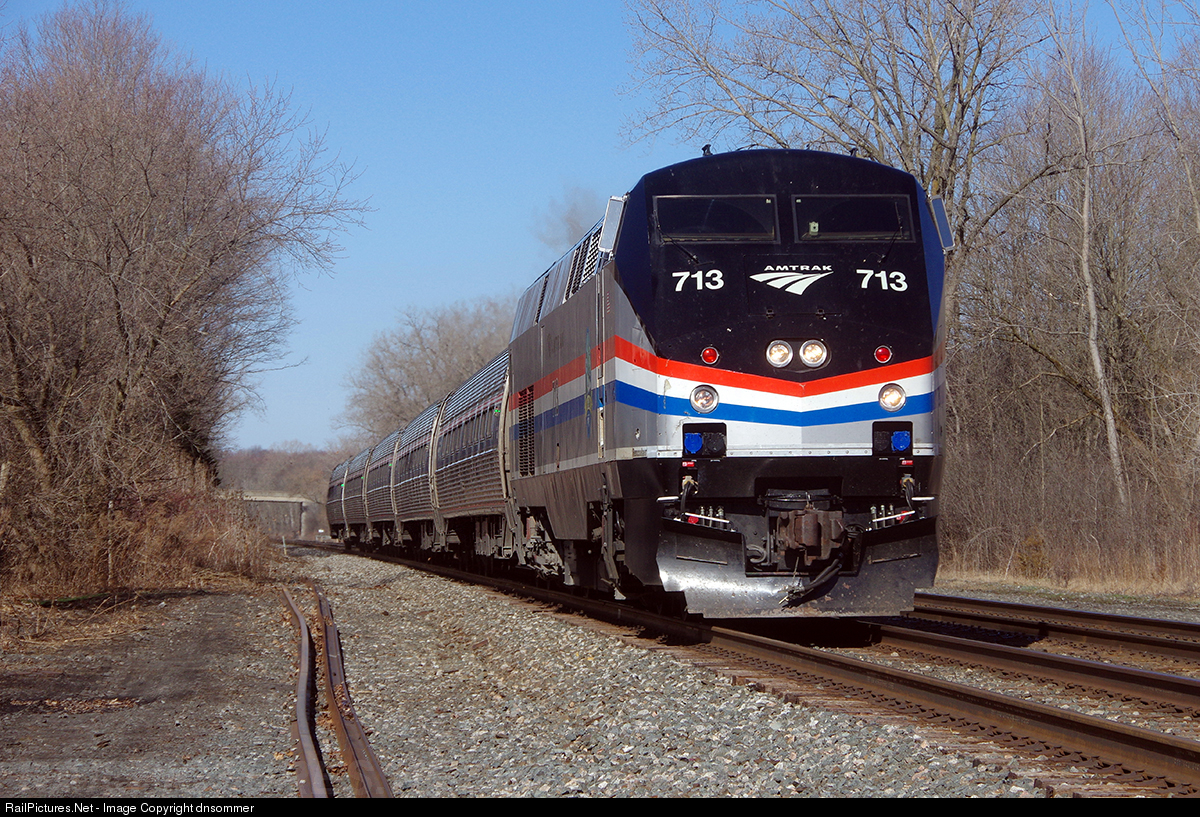 | Amtrak 713 leading Empire Service Train 284 from Niagara Falls to New York City at Port Byron, New York at 10:22 a.m. on March 22, 2020. |