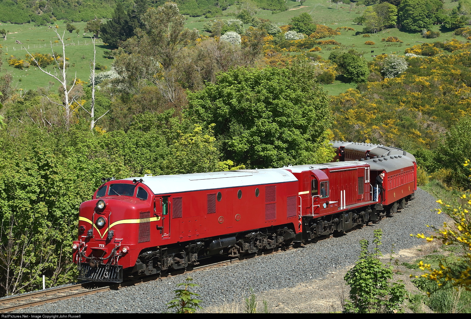 | English Electric built DG 772 and DI 1102 locomotives restored by Diesel Traction Group round a curve near Seacliff working a special run by Steam Incorporated returning to Christchurch. 772 entered service as DH 772 in 1956 and bought by DTG after being retired in 1983. 1102 was built by English Electric Rocklea works in Queensland in 1966 and bought by DTG in 1989. |