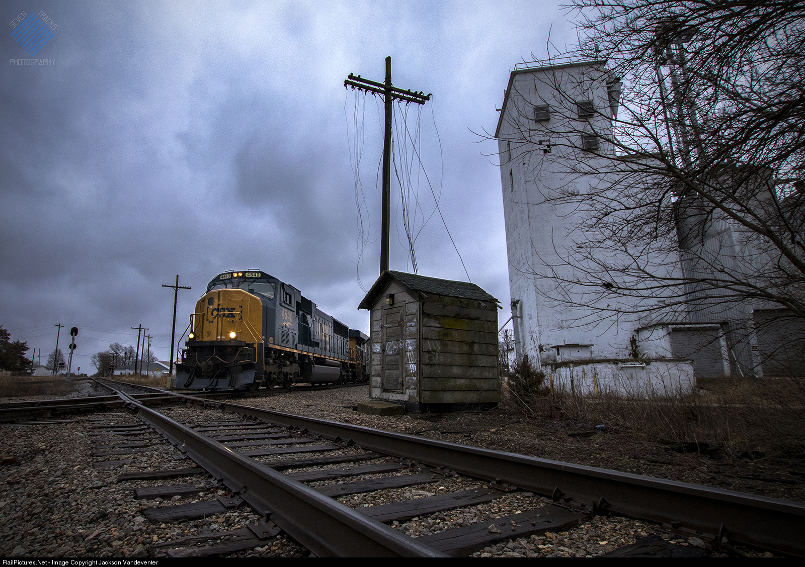 | A CSX SD70MAC prepares to slam the former EIRC diamond at Metcalf with a grain train for Tuscola. The DREI took over the EIRC at the beginning of 2020, marking the end of gray GP9 and 10 locomotives trundling the former NKP rails. |