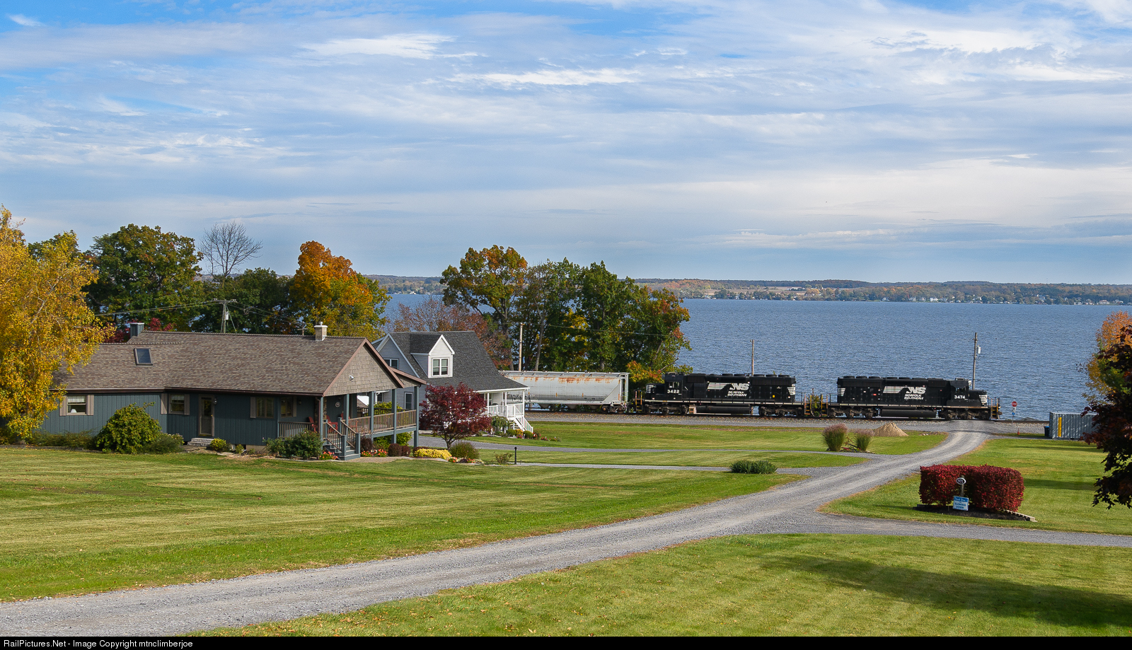 | As Norfolk Southern's H06 heads south on the Corning Secondary, the line follows the edge of Seneca Lake near Angus, New York. The picturesque lakeside cottages are a unique contrast to the industrial nature of the railroad passing by. |
