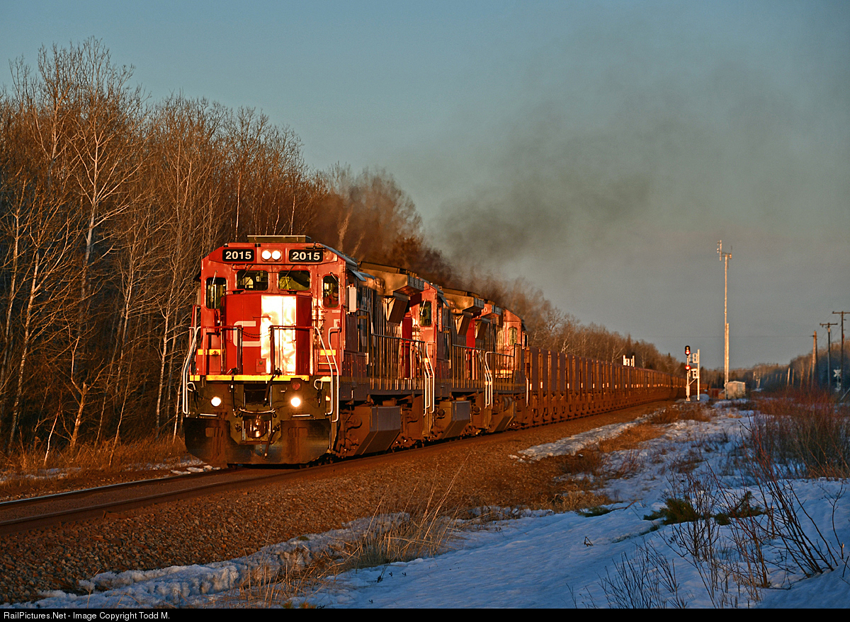 | After waiting for a unit oil train to roll south across the Ramshaw diamond in front of them, CN 2015 is back underway towards Minntac just seconds before the sun is lost for the day. |