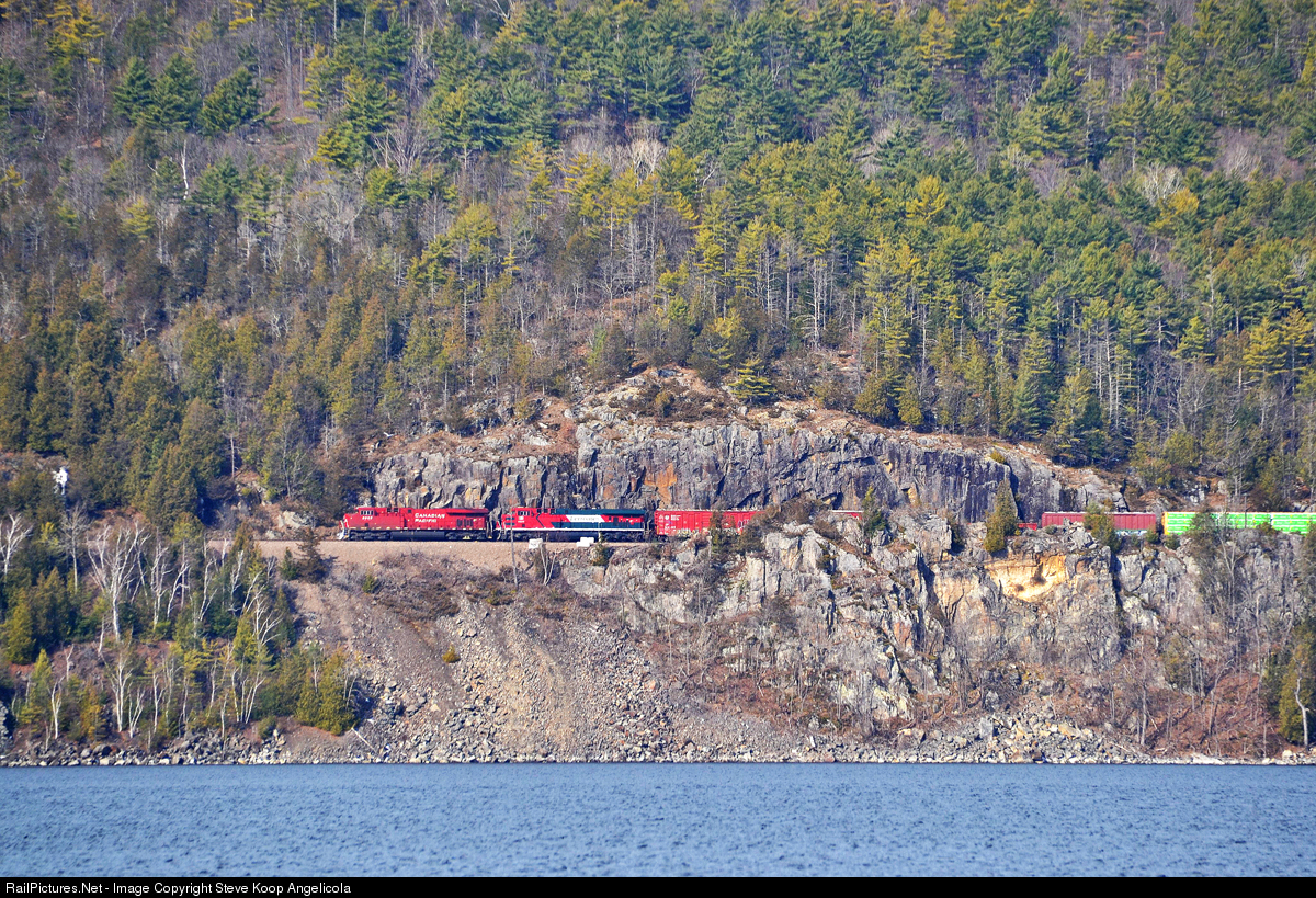 | Canadian Pacific train 252 is passing through the famous "Red Rocks" area high above Willsboro Bay on Lake Champlain with an interesting power lashup of CP 8955, FXE (Ferromex) 4609 and the CP 7010 heritage unit as the mid train DPU. The huge 9952' train is the result of the previous days train being cancelled. |