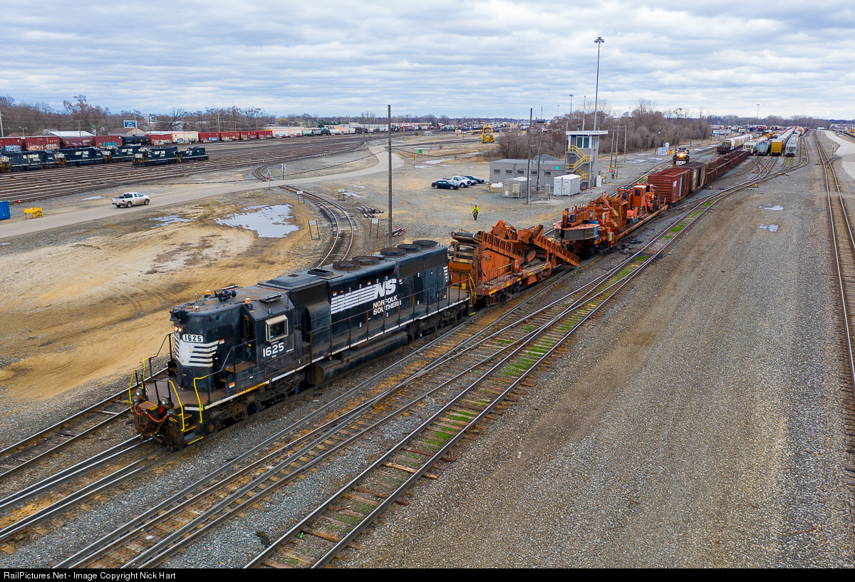 This is one heck of a catch for 2020! NS 1625, a high hood SD40-2, switches cars at the west end of Elkhart Yard on a very windy afternoon. 1625 was built in September of 1973 for the Norfolk & Western and still retains its original number from it's N&W days. With over 46 years of service under its belt, the veteran shows some signs of wear, but it still soldiers on.