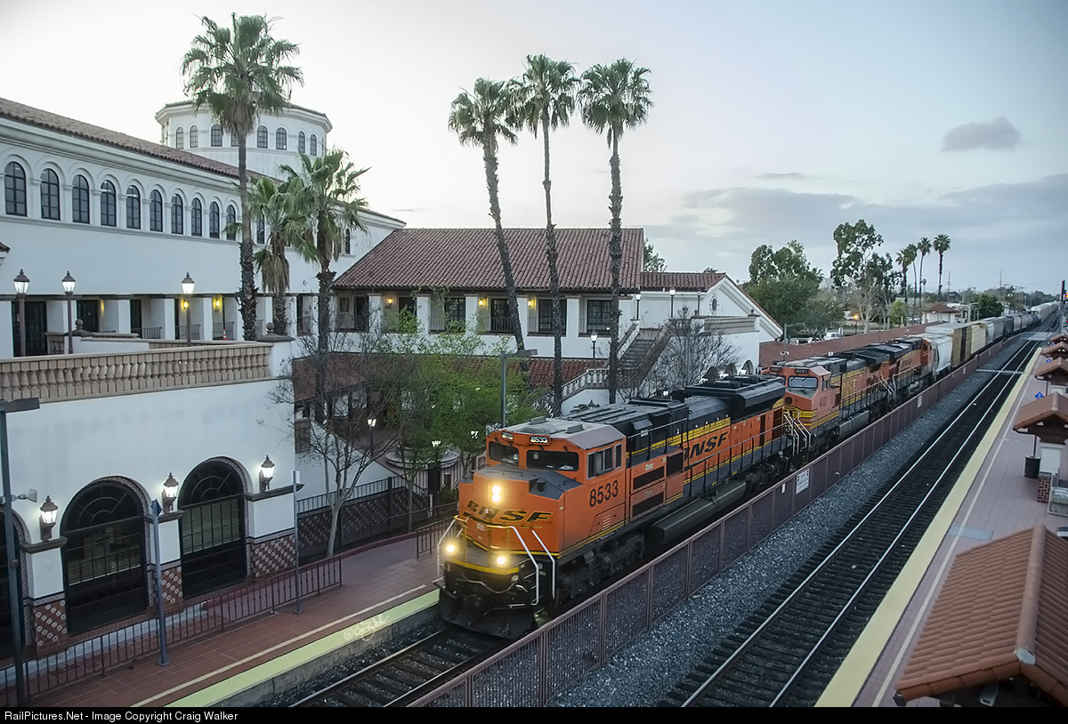 BNSF Railway train H-BARSDG1-29 passes through an eerily empty Santa Ana Regional Transportation Center as the sun sets at 7:09 pm (19:09) on March 29, 2020. This High Priority Merchandise train is traveling from Barstow CA to San Diego CA, with BNSF SD70ACe 8533, Dash 9-44CW 4081 and ES44AC 5991 up front, and with ES44AC 6107 and SD70MACE 9769 for the rear DPUs. (Santa Ana, California – March 29, 2020)