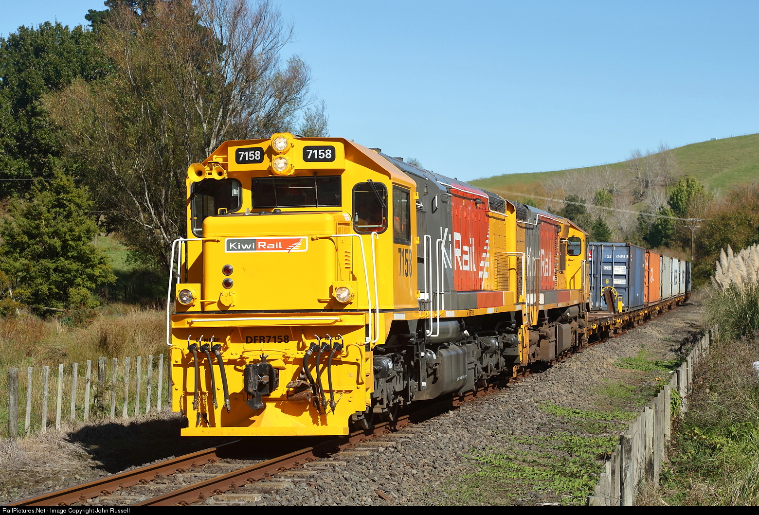| DFB 7158 leads 7049 on train 126 to Whangarei passing through back country between Kaipara Flats and Wellsford. The line which has been under threat of closure for many years is soon closing for major work including increasing clearance in the 13 tunnels which is hoped to keep the line operational. |