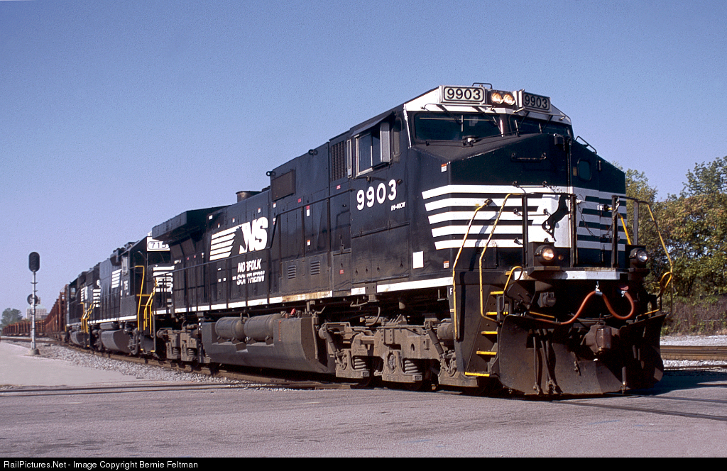 | Norfolk Southern C40-9W #9903 leads an empty rail train off the N.A. District and on to the Passenger Main at 27th Street interlocking. #9903 was built September 2004 as part of order #1972 for 167 units |